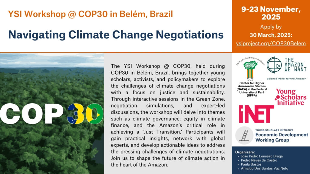 Are you a young scholar passionate about climate justice and sustainability? Join us in Belém for the YSI Workshop @ COP30, where researchers, practitioners, and policymakers will explore how global climate negotiations can drive equitable and sustainable solutions.