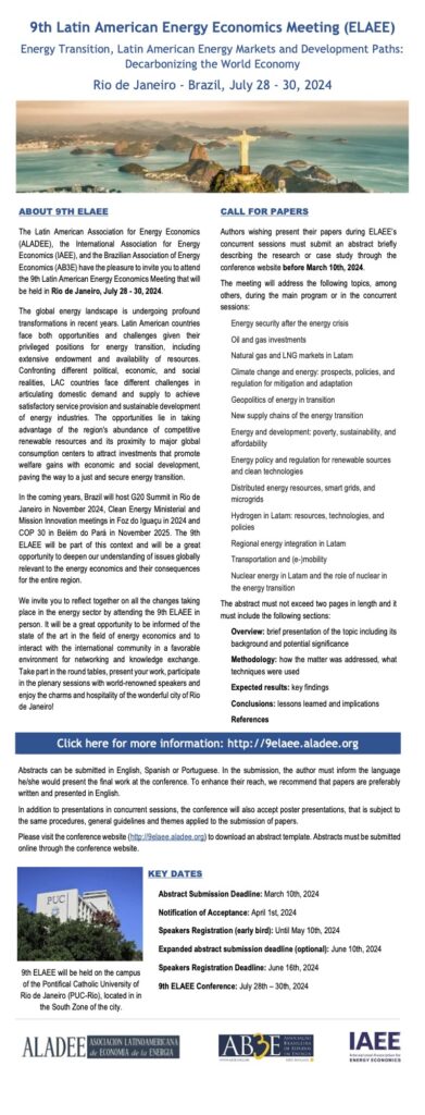 The Latin American Association for Energy Economics (ALADEE), the International Association for Energy Economics (IAEE), and the Brazilian Association of Energy Economics (AB3E) have the pleasure to invite you to attend the 9th Latin American Energy Economics Meeting that will be held in Rio de Janeiro, July 28 – 30, 2024.