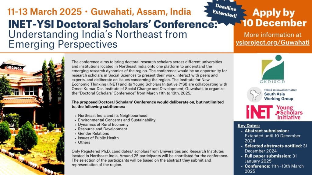 The conference aims to bring doctoral research scholars across different universities and institutions located in Northeast India onto one platform to understand the emerging research dynamics of the region. The conference would be an opportunity for research scholars in Social Sciences to present their work, interact with peers and experts, and deliberate on issues concerning the region. The Institute for New Economic Thinking (INET) and its Young Scholars Initiative (YSI) are collaborating with Omeo Kumar Das Institute of Social Change and Development, Guwahati, to organize the “Doctoral Scholars’ Conference” from March 11th to 13th, 2025.