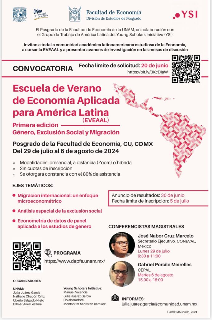 The Postgraduate Program of the Faculty of Economics at the National Autonomous University of Mexico (UNAM), in collaboration with the Latin America Working Group, cordially invites you to apply for the First Edition of the Summer School of Applied Economics for Latin America (EVEAAL). This unique program, featuring a hands-on approach, is scheduled to take place from July 29th to August 6th, 2024, in a hybrid format that accommodates both in-person and online participation.