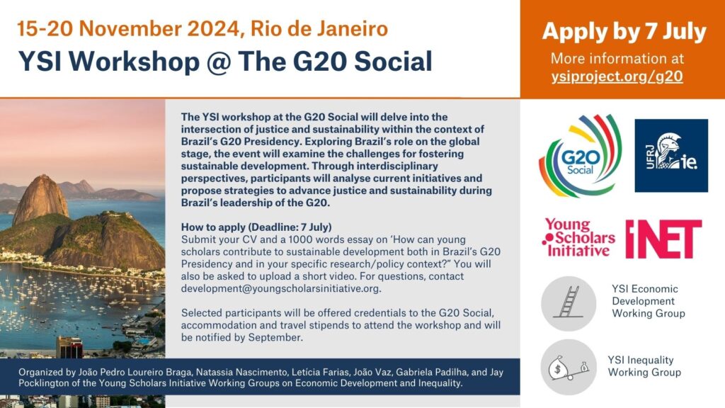 You can apply to the workshop with this through our event website by the 14th of July. You will be asked to submit your CV and a 1.000 words essay on ‘How can young scholars contribute to sustainable development both in Brazil’s G20 Presidency and in your specific research/policy context?”. You will also be asked to upload a video and add the link to it. Any questions on the applications should be directed to development@youngscholarsinitiative.org. Selected participants will be offered credentials to the G20 Social, accommodation and travel stipends to attend the workshop and will be notified as soon as possible and by September maximum.