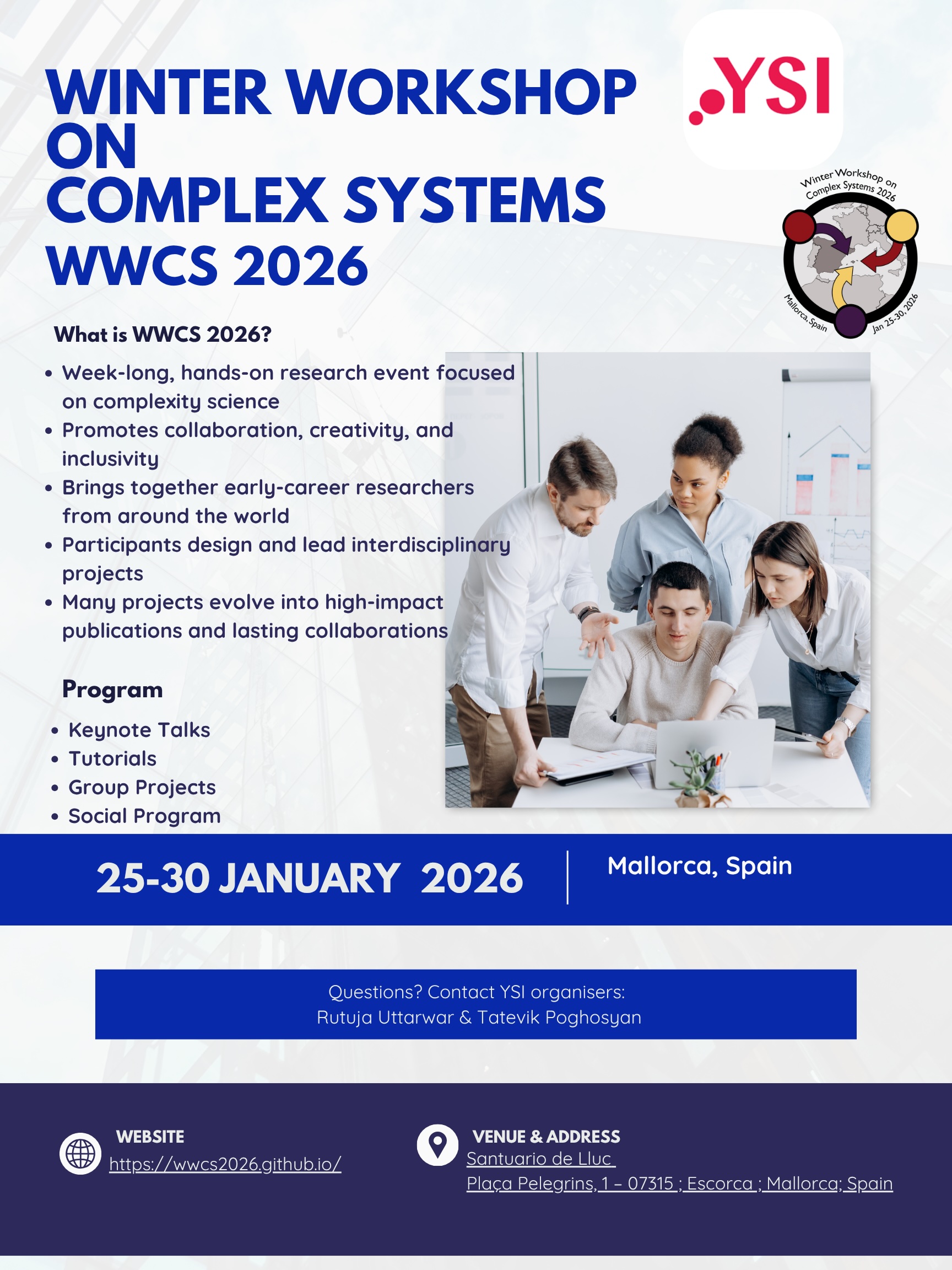 Winter Workshop on Complex SystemsThe Winter Workshop on Complex Systems (WWCS 2026) is a week-long research event taking place from January 25–30, 2026, in Spain. It brings together early-career researchers from around the world […] |